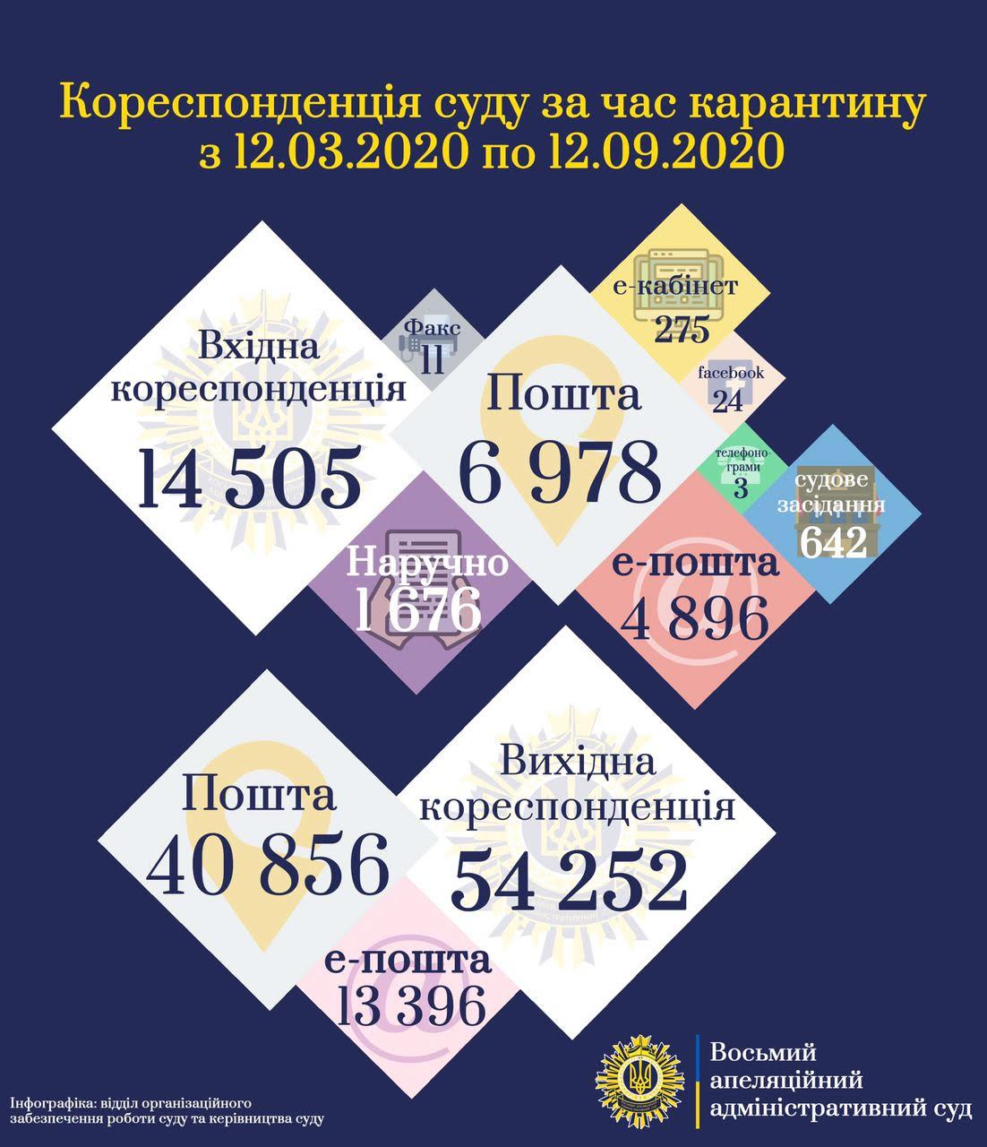 Щодо вихідної кореспонденції за період карантину зауважимо, що Восьмим ААС направлено 54 252 документів, з них: