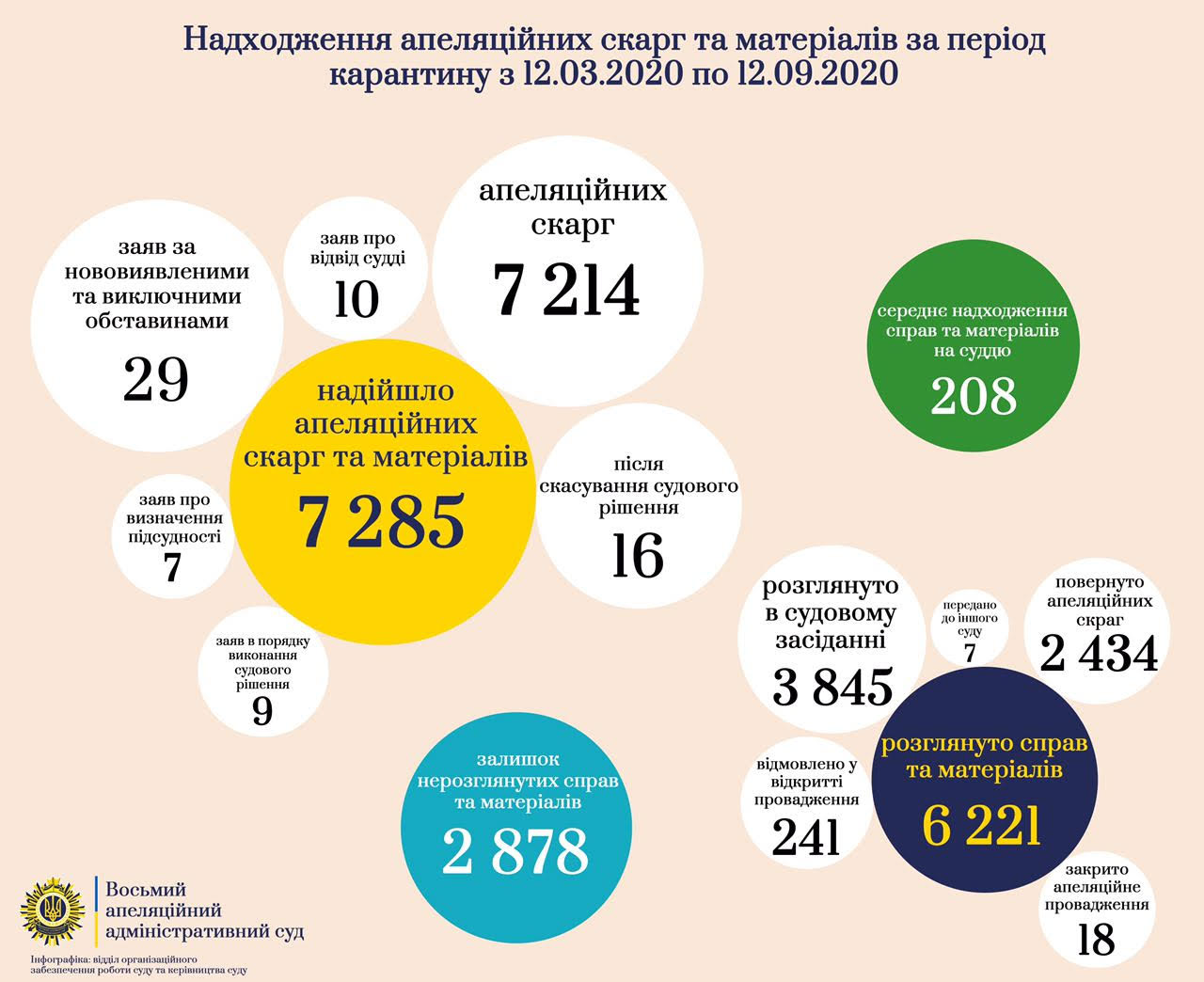 Для більш предметного відображення результатів роботи Восьмого ААС за період з 12 березня по 12 вересня 2020 року наведемо статистичні дані в розрізі показників здійснення судочинства та масштабів документообігу.
