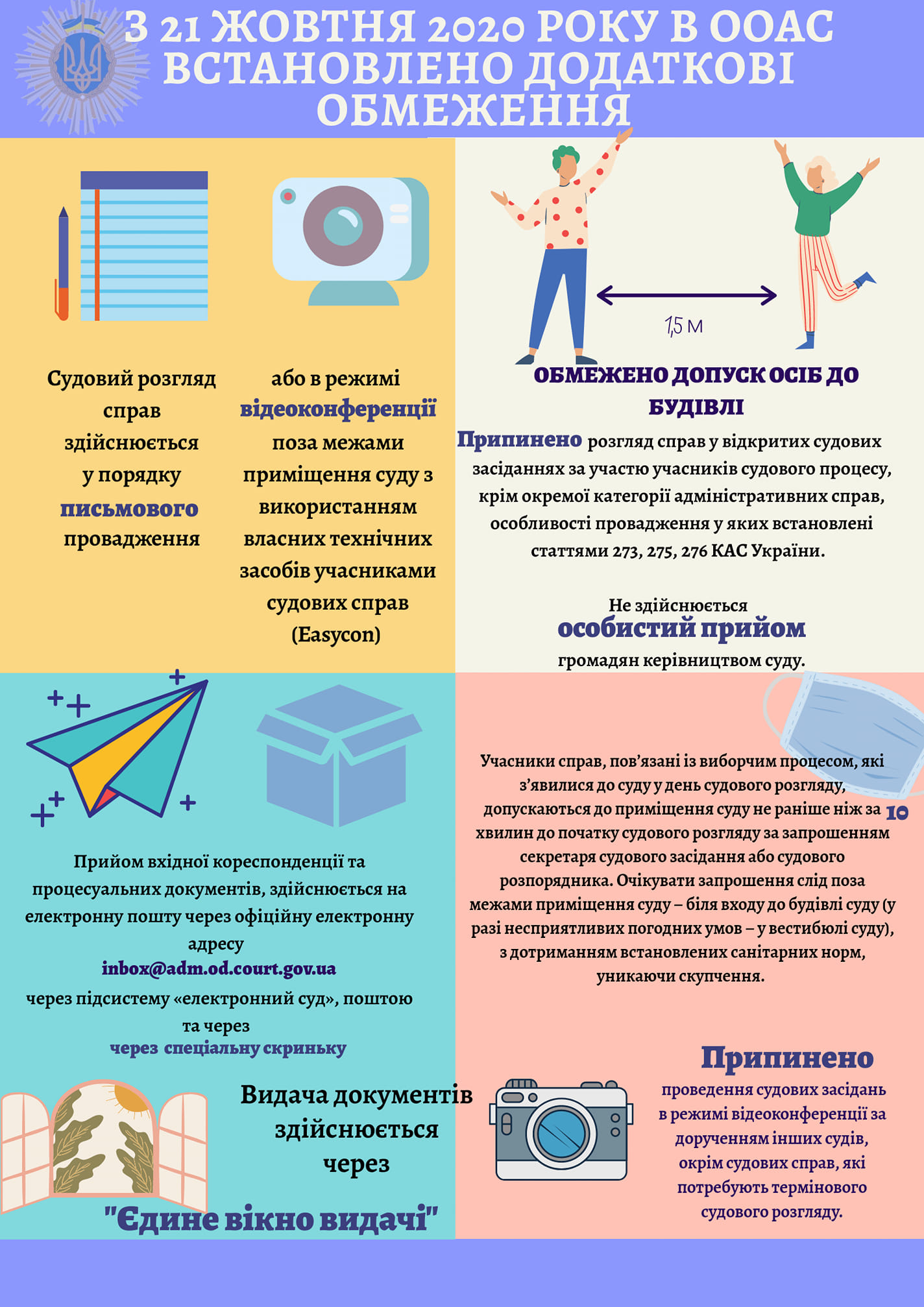 ООАС завжди піклується про безпеку своїх відвідувачів. Вважаємо, що з розвитком подій в країні відвідування громадських місць, зокрема, пошти може призвести до поширення гострої респіраторної хвороби COVID-19, спричиненої коронавірусом SARS-CoV-2, яка створює загрозу для життя та здоров’я. Саме тому ООАС пропонує подавати всі процесуальні документи до суду за допомогою зручної підсистеми «Електронний суд».