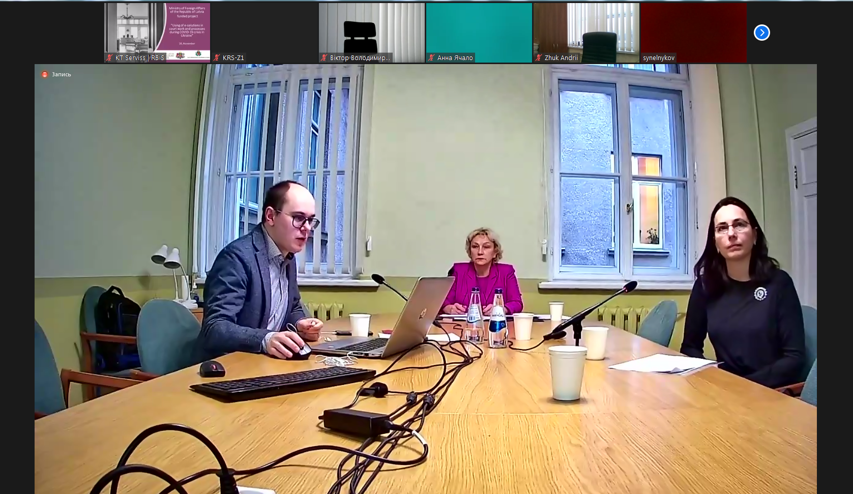 Суддя ВП ВС Олена Кібенко поцікавилась у латвійських колег, чи в їхніх судах під час пандемії судді збираються разом для обговорення справ в одному залі, чи практикують дистанційне обговорення та чи має суддя віддалений доступ до електронної системи управління справами, чи може з дому працювати, підписувати документи.