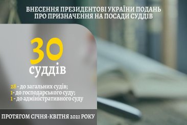 В інформаційно-аналітичній довідці про діяльність Вищої ради правосуддя та Дисциплінарних палат Вищої ради правосуддя за січень – квітень 2021 року зазначено, що за цей період Вища рада правосуддя прийняла рішення про внесення Президентові України подання про призначення на посади 30 суддів до місцевих судів, з них: