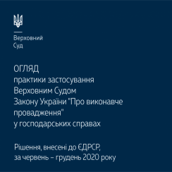 Огляд, який охоплює рішення, внесені до ЄДРСР, у червні – грудні 2020 року, містить висновки Верховного Суду, які сприятимуть сталості та єдності судової практики у справах щодо застосування положень Закону України «Про виконавче провадження», зокрема, стосовно таких питань: