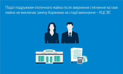 Місцевий суд, з яким погодився апеляційний суд, задовольнив заяву приватного виконавця про заміну сторони у виконавчому провадженні (боржника), оскільки магазин і земельну ділянку, на які в судовому порядку звернено стягнення через невиконання умов договорів кредиту й іпотеки, суд згодом поділив між боржником і його дружиною як майно подружжя, по 1/2 частині. При поділі нерухомого майна до дружини разом із правом власності на частину предмета іпотеки перейшли всі права і обов’язки іпотекодавця.
