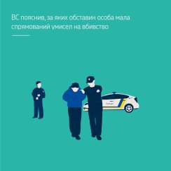 Вирішуючи питання про наявність умислу в обвинуваченого на вбивство поліцейського, колегія суддів погодилася з висновком місцевого суду, що сукупність усіх обставин вчиненого діяння, спосіб вчинення злочину та його знаряддя (нанесення удару ножем у ділянку життєво важливих органів, намагання нанести удар ножем повторно, а також динамічність його дій, агресивна поведінка під час вчинення злочину, локалізація та ступінь тяжкості отриманих потерпілим тілесних ушкоджень, які є тяжкими за ознаками небезпеки для життя) у цьому випадку дають підстави зробити висновок про спрямованість умислу особи саме на умисне вбивство поліцейського, що не було доведено до кінця з причин, які не залежали від її волі.