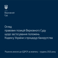 Огляд містить правові висновки Верховного Суду, які сприятимуть забезпеченню сталості та єдності судової практики у справах щодо застосування положень КУзПБ і дадуть змогу зрозуміти основні підходи до вирішення проблемних питань, що виникають стосовно: