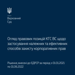 Пропонуємо до вашої уваги огляд правових позицій Касаційного господарського суду у складі Верховного Суду щодо застосування належних та ефективних способів захисту корпоративних прав (рішення, внесені до ЄДРСР за період із 1 січня 2021 року по 1 червня 2022 року).