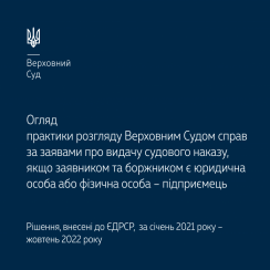 Пропонуємо до уваги огляд практики розгляду Верховним Судом справ за заявами про видачу судового наказу, якщо заявником та боржником є юридична особа або фізична особа – підприємець (рішення, внесені до ЄДРСР, за січень 2021 року – жовтень 2022 року) – https://bit.ly/3X4WzKb.