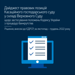 Пропонуємо до уваги дайджест правових позицій Касаційного господарського суду у складі Верховного Суду щодо застосування положень Кодексу України з процедур банкрутства (рішення, внесені до ЄДРСР за листопад – грудень 2022 року) – https://bit.ly/3SefrnY.