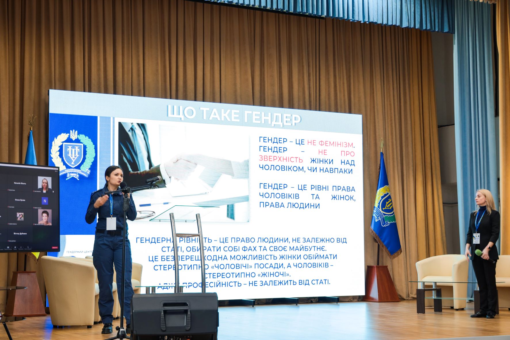 Спікерами на заході, який проходив у форматі онлайн та офлайн, були радниця Служби судової охорони, керівництво Департаменту патрульної поліції, Державної судової адміністрації України, Полтавської обласної військової адміністрації, Полтавської обласної ради, представники секретаріату Верховної Ради України з прав людини, представники ООН-Жінки та Консультативної місії Європейського союзу з прав людини.