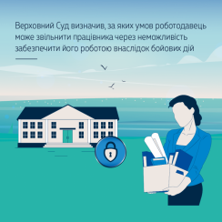 Роботодавець може звільнити працівника за своєю ініціативою, якщо не може забезпечити його роботою, що безпосередньо пов’язано з повним знищенням виробничих, організаційних та технічних умов, засобів виробництва або його майна внаслідок бойових дій. Таке знищення чи відсутність умов має бути безпосереднім наслідком бойових дій. Такого висновку дійшов Касаційний цивільний суд у складі Верховного Суду в постанові від 27 вересня 2023 року.
