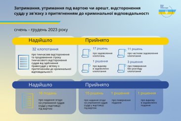 Загалом упродовж 2023 року до ВРП надійшло 16 подань про надання згоди на утримання судді під вартою. Прийнято 1 рішення про повернення подання про надання згоди на утримання судді під вартою та 1 рішення про відмову у задоволенні подання про надання згоди на утримання судді під вартою за результатами розгляду подання, яке надійшло 21 червня 2022 року.