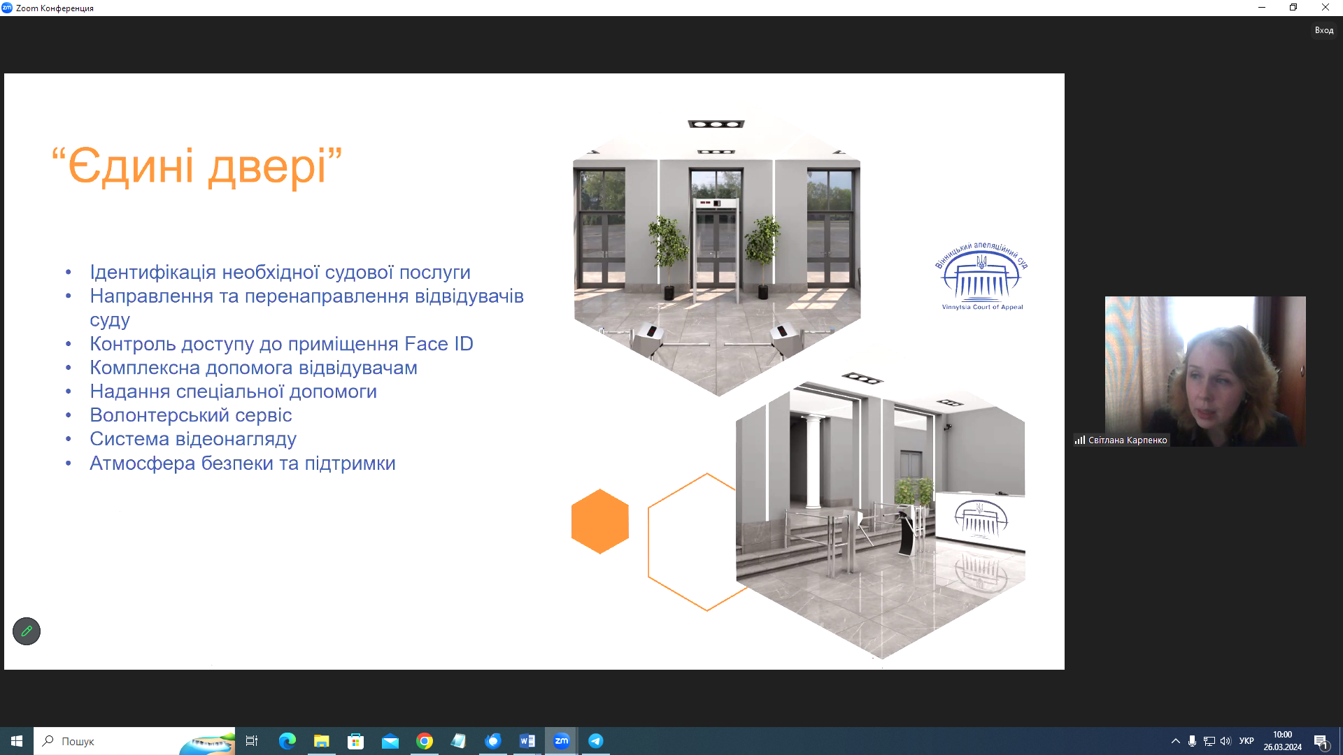 Як же Вінницький апеляційний суд втілює в свою роботу принцип людиноцентричності, розповіла на тренінгу Світлана Карпенко. Увагу зосередила на створеній в укритті установи судовій залі, завдяки якій правосуддя доступне і під час повітряної тривоги; повідомила про особливості роботи служби підтримки постраждалих від домашнього насильства. За словами Світлани Карпенко, майже за рік роботи цього сервісу інформаційний супровід надано майже тридцятьом особам, особистий за участю судового волонтера – двом, стількох же перенаправлено до Центру безоплатної правової допомоги. Повідомила вона і про концепцію «Єдиних дверей».