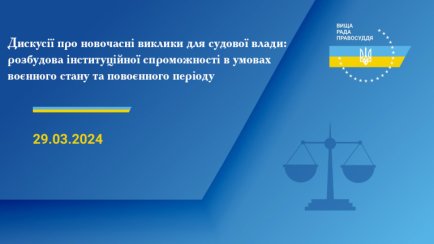 Сьогодні, 29 березня 2024 року, о 10:00 відбудуться "Дискусія про новочасні виклики для судової влади розбудова інституційної спроможності в умовах воєнного стану та повоєнного періоду".