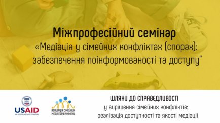 Семінар проводиться в межах проєкту "Шляхи до справедливості у вирішенні сімейних конфліктів: реалізація доступності та якості медіації", що впроваджується за підтримки американського народу, наданої через Агентство США з міжнародного розвитку (USAID) в рамках Програми "Справедливість для всіх".