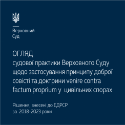 Впродовж своєї діяльності Верховний Суд послідовно напрацьовував орієнтири в застосуванні принципу доброї совісті в судовій практиці. Матеріал демонструє комплексне бачення Верховного Суду щодо розуміння та значення принципу доброї совісті й такого його прояву, як доктрина venire contra factum proprium (заборона суперечливої поведінки), у різних категоріях спорів.