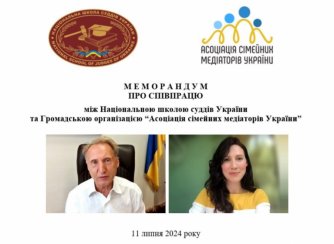 11 липня 2024 року ректор Національної школи суддів України Микола Оніщук та виконувач обов’язків голови Правління ГО "Асоціація сімейних медіаторів України" Ірина Федорич в дистанційному форматі підписали Меморандум про співробітництво між державною установою суддівської освіти та громадською організацією.