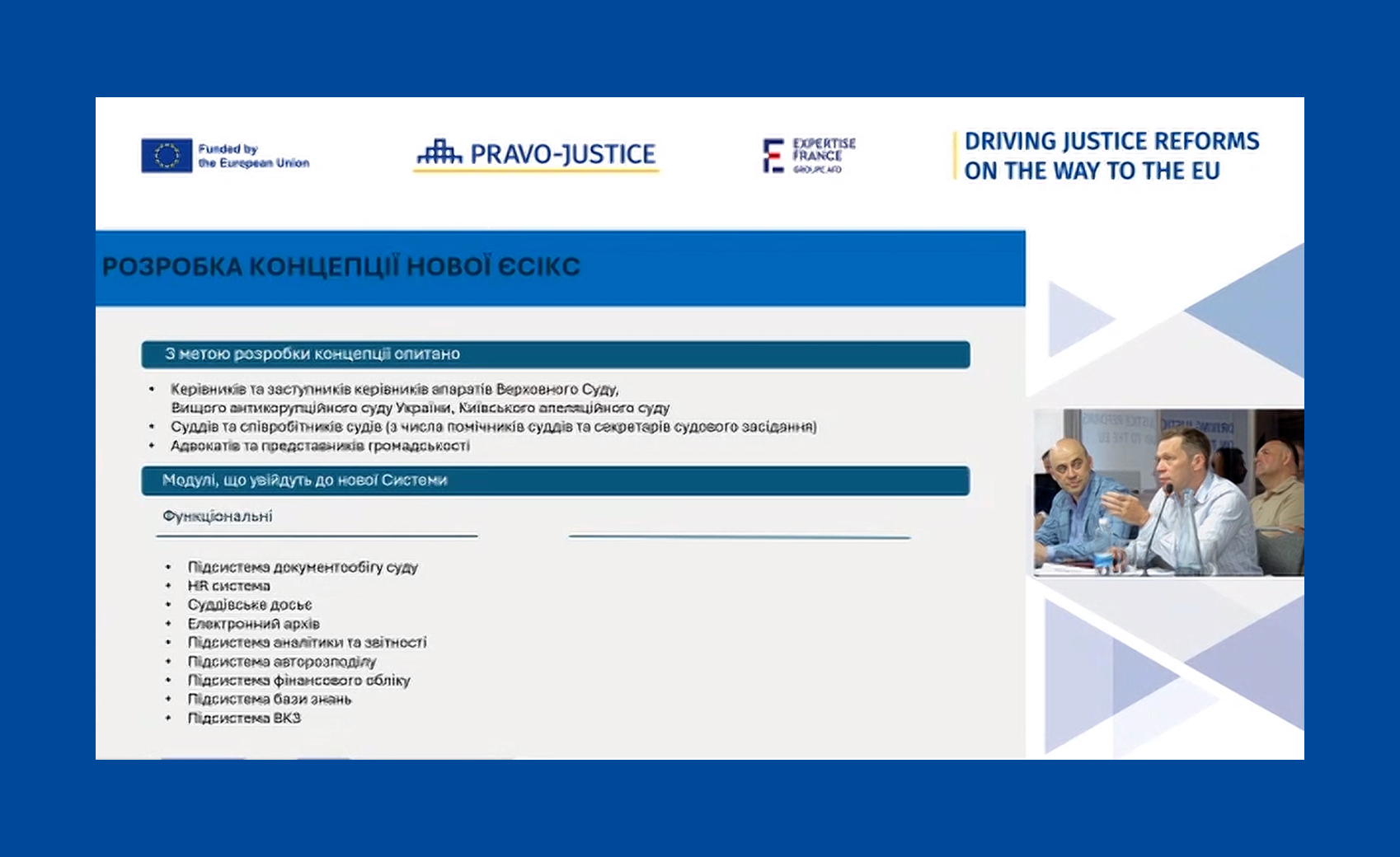 У свою чергу, заступник голови ДСА України з питань цифровізації Леонід Сапельніков, розповідаючи про спільні напрацювання, зазначив: «За підтримки Проєкту ЄС «Право-Justice» було проведено технічний аудит Єдиної судової інформаційно-телекомунікаційної системи (ЄСІТС) і наразі здійснюється аудит функціональний. Технічний аудит дав змогу проаналізувати всі модулі ЄСІТС та зробити висновок про те, що більшість їх – технічно застарілі.