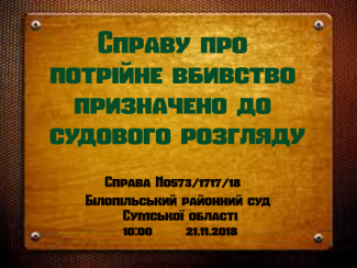 Кримінальне провадження за обвинувальним актом стосовно особи, яка обвинувачується в потрійному вбивстві та незаконному придбанні, носінні, зберіганні вибухової речовини без передбаченого законом дозволу, призначено до судового розгляду на 10:00 годину 21 листопада 2018 року. У судове засідання викликані прокурор, потерпілі, їх адвокат, обвинувачений і його адвокат, свідки.