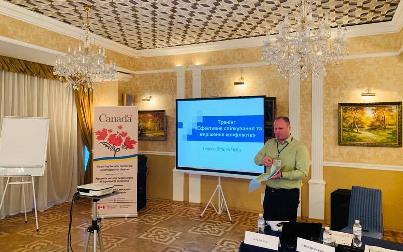 У перший день тренінгу тренер розповів про складові ефективного спілкування, його алгоритм, основні стратегії поведінки в конфлікті та комунікаційні стратегії пом’якшення конфліктів.