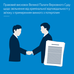 Велика Палата ВС дійшла висновку, що у випадку заподіяння кримінальним правопорушенням шкоди у вигляді смерті потерпілого звільнення від кримінальної відповідальності у зв’язку з примиренням винного з потерпілим у контексті ст. 46 КК України не можливе.