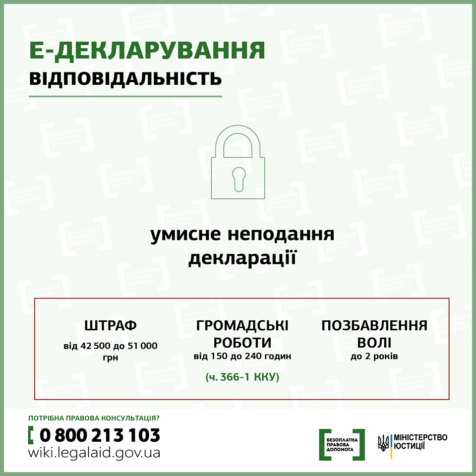 Звертаємо увагу на те, що порушення вимог фінансового контролю, умисне недекларування або декларування недостовірної інформації є корупційними правопорушеннями, за які передбачено адміністративну (стаття 172-6 Кодексу України про адміністративні правопорушення) та кримінальну (стаття 366-1 Кримінального кодексу України) відповідальність.