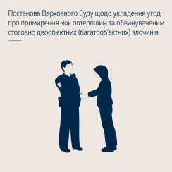 Зазначені рішення судів першої та апеляційної інстанцій ВС вважає законними, обґрунтованими й такими, що узгоджуються з правовою позицією Верховного Суду України, викладеною в постанові від 31 березня 2016 року (справа № 5-27кс16). Згідно з цією позицією, визначаючи, чи можна укладати угоди про примирення між потерпілим та обвинуваченим щодо злочинів середньої тяжкості – двообʼєктного (багатообʼєктного) злочину (ч. 2 ст. 345 КК України), суд має керуватись не тільки формальними вимогами норм статей 468, 469, 474 КПК України щодо видів угод про примирення і класифікацію злочинів, стосовно яких такі угоди можуть укладатися, а й чітко дотримуватись їхніх засадничих принципів. Для встановлення співвідношення публічних і приватних пріоритетів в інституті примирення сторін визначальною є категорія «інтерес».