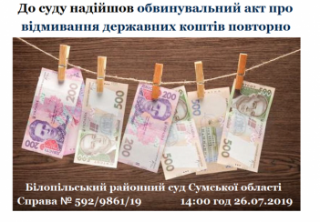 До Білопільського районного суду Сумської області надійшов обвинувальний акт стосовно громадянки С., обвинуваченої за частиною другою статті 209 Кримінального кодексу України (легалізація (відмивання) доходів, одержаних злочинним шляхом, вчинена повторно).
