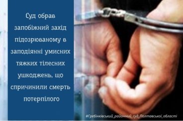 20 листопада 43-річному мешканцю Гребінки, підозрюваному в нанесенні умисних тяжких тілесних ушкоджень, небезпечних для життя в момент заподіяння, що спричинили смерть потерпілого (частина друга статті 121 Кримінального кодексу України), слідчим суддею Гребінківського районного суду Полтавської області було обрано запобіжний захід у вигляді тримання під вартою строком на 60 днів без права внесення застави.
