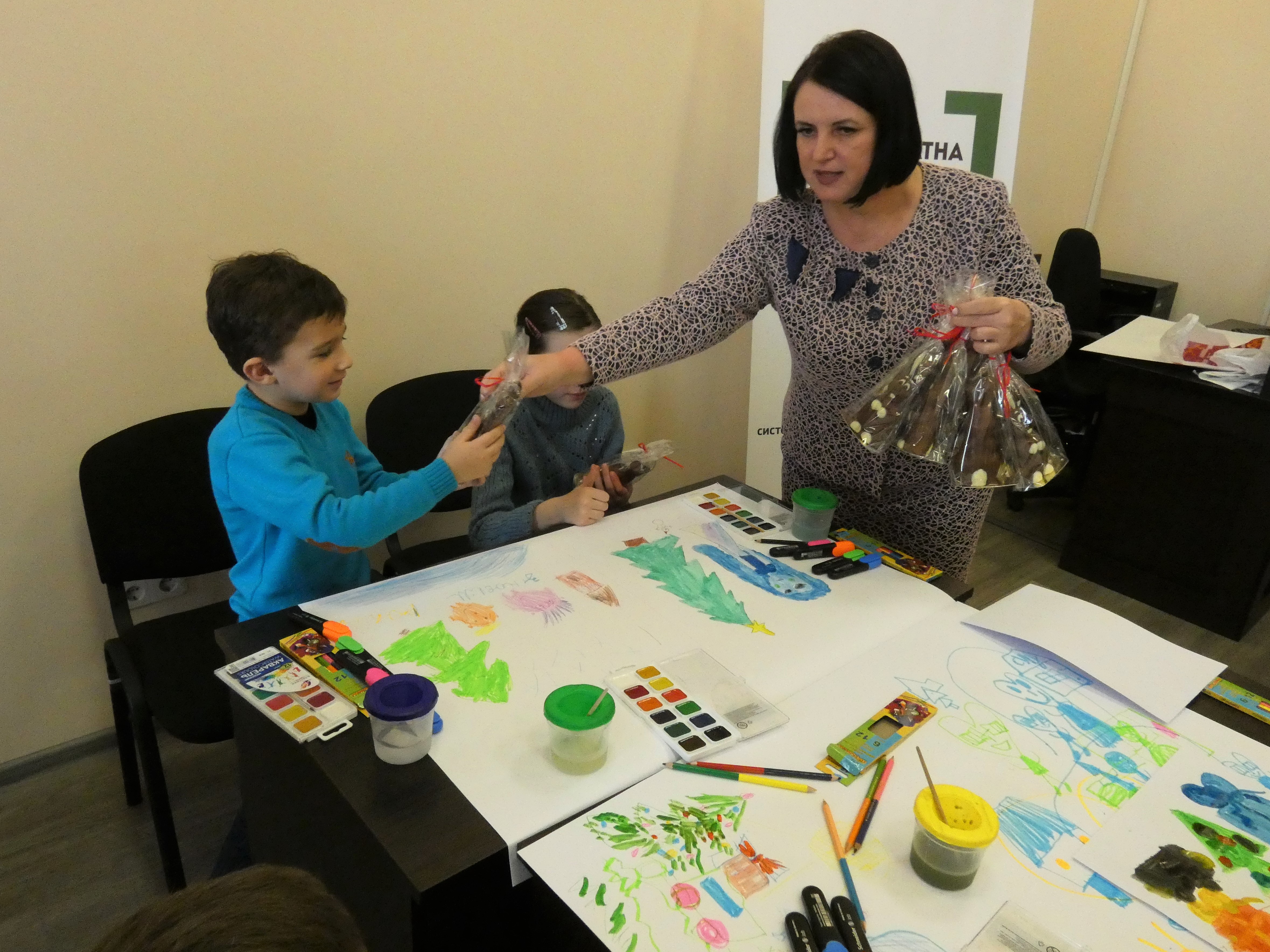 Малювали ж діти упродовж години: зображували новорічні і судові атрибути, казкові храми Феміди і навіть динозаврів. Потім свої роботи подарували суду, а Тетяна Шемета від імені суддів презентувала юним художникам солодкі призи і набори для малювання.