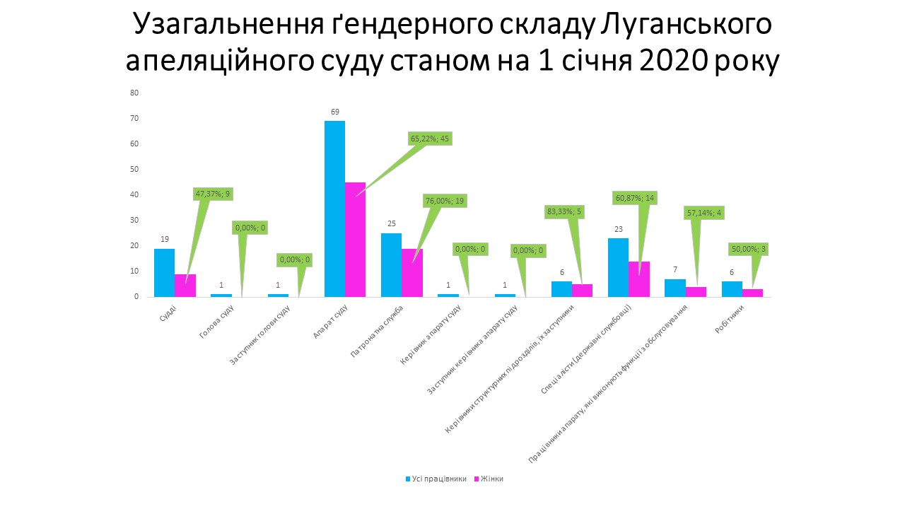 Станом на 01.01.2020 в суді працює 88 осіб, переважну більшість складають жінки – 68 відсотки. Більш детальну інформація відображено в таблиці.