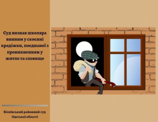 Днями, Біляївський районний суд Одеської області визнав неповнолітнього Ж. (учня 9 класу) винним у скоєнні злочину, передбаченого частиною третьою статті 185 Кримінального кодексу України (таємне викрадення чужого майна (крадіжка), поєднане з проникненням у житло та сховище) і призначив йому покарання у виді 3 років позбавлення волі, звільнивши його від відбування покарання з випробуванням строком на 1 рік та поклавши на засудженого обов’язки періодично з’являтися для реєстрації до уповноваженого органу з питань пробації, повідомляти уповноважений орган з питань пробації про зміну місця проживання, роботи або навчання та виконувати заходи, передбачені пробаційною програмою «Зміна прокримінального мислення».