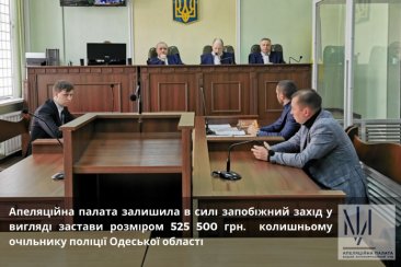Сьогодні, 10 лютого 2020 року, Апеляційна палата Вищого антикорупційного суду розглянула апеляційну скаргу підозрюваного, колишнього очільника поліції Одеської області, на ухвалу слідчого судді Вищого антикорупційного суду від 17 січня 2020 року, якою підозрюваному змінено запобіжний захід з домашнього арешту на заставу у розмірі 525 500 грн.