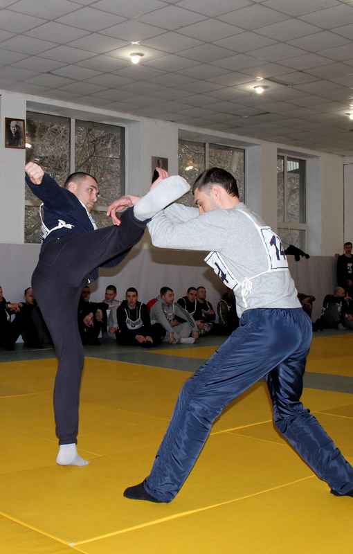 У перерві між іспитами перед учасниками виступив президент Всеукраїнської федерації рукопашного бою Олександр Гартвич, який не тільки продемонстрував деякі з прийомів, а й пояснив техніку затримання залежно від пори року.