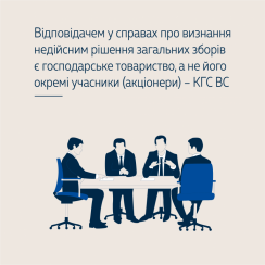 ВС констатує, що відповідачем у справах про визнання недійсним рішення загальних зборів є господарське товариство, а не його окремі учасники (акціонери), оскільки відповідне рішення є результатом волевиявлення не окремого учасника, а загальних зборів учасників як органу товариства.