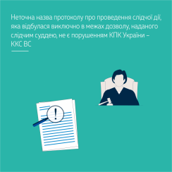 Втім, зі змісту цього протоколу та інших матеріалів провадження видно, що така слідча дія проводилася лише в службовому кабінеті без відома особи, тобто виключно в межах дозволу, наданого ухвалою слідчого судді. Тому те, що працівник поліції склав протокол з назвою «Про результати здійснення аудіо, відео контролю особи» замість «Про результати здійснення аудіо, відео контролю місця», не є порушенням вимог КПК України,  яке в силу положень ст. 412 КПК України можна визнати істотним і яке перешкодило чи могло перешкодити суду ухвалити законне та обґрунтоване судове рішення.