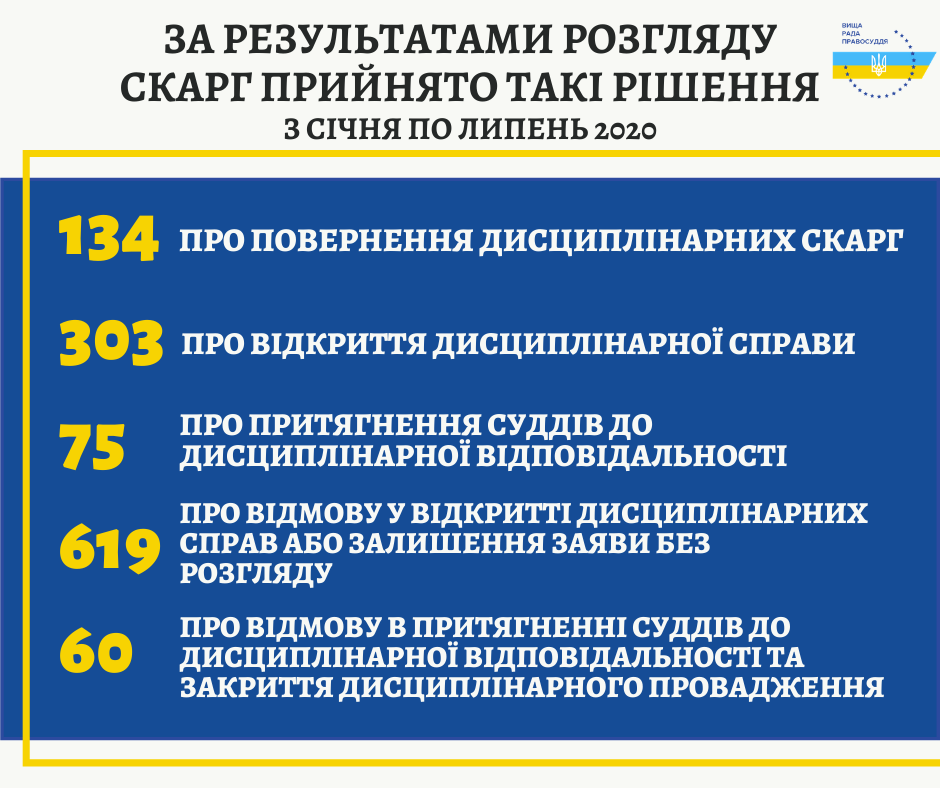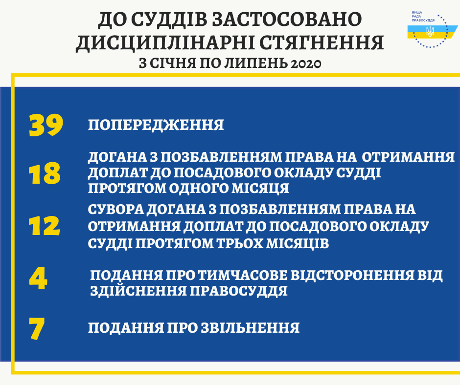 Усього за перші сім місяців 2020 року Дисциплінарні палати ВРП прийняли 75 рішень про притягнення до дисциплінарної відповідальності 80 суддів. За результатами розгляду дисциплінарних справ до суддів застосовані такі види дисциплінарних стягнень: