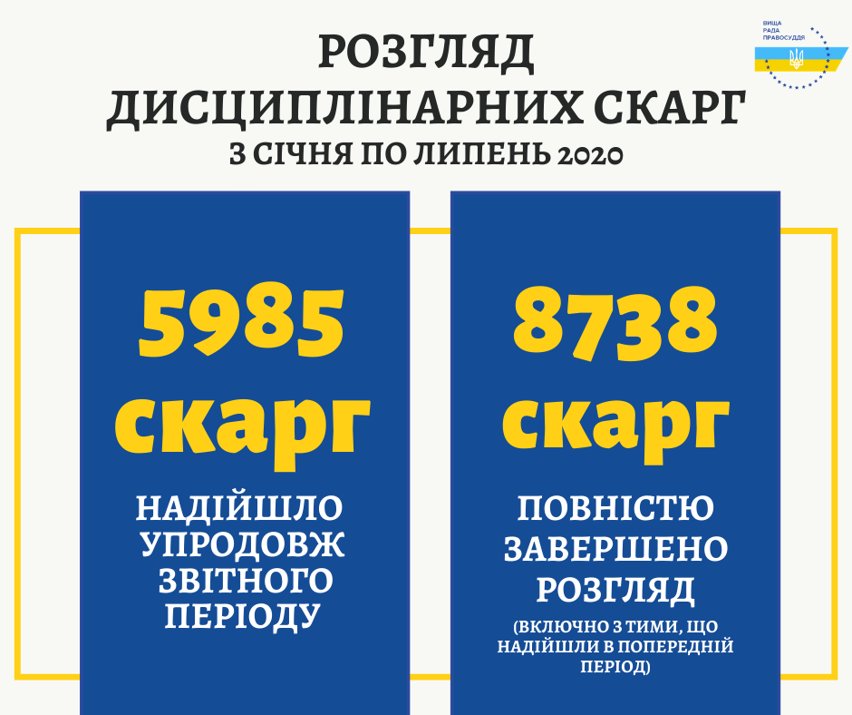 Упродовж цього періоду Дисциплінарні палати та члени ВРП повністю завершили розгляд 8738 дисциплінарних скарг, включно з тими, що надійшли у попередні роки. У 2019 року за такий самий період було розглянуто 8629 скарг.