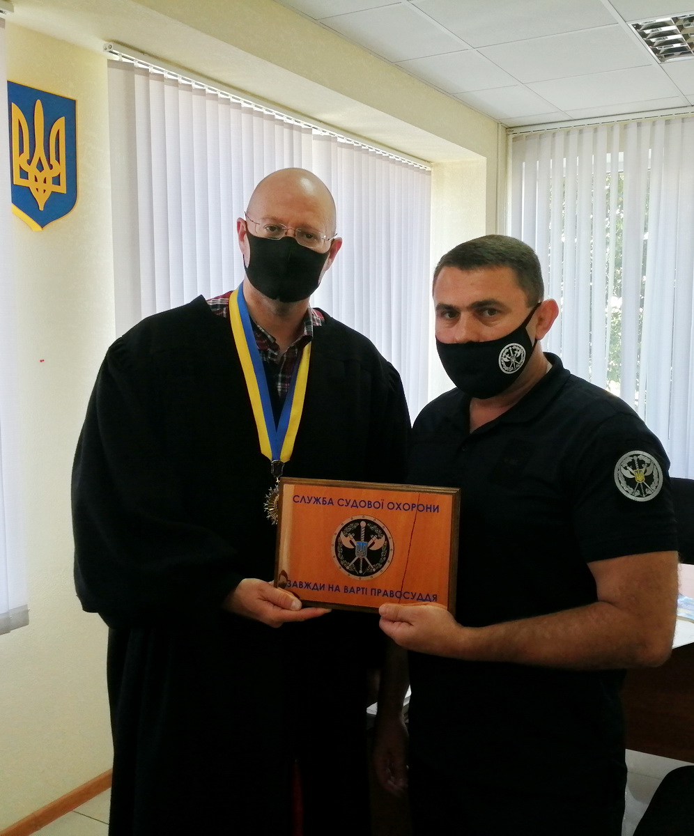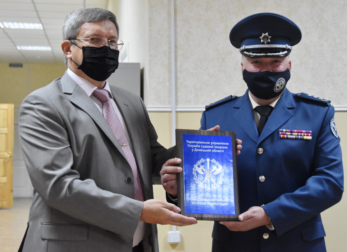 На знак того, що відтепер Перший апеляційний адміністративний суд охороняється Територіальним управлінням Служби у Донецькій області, полковник Служби судової охорони Андрій Єпур вручив голові суду Ігореві Геращенку плакетку.