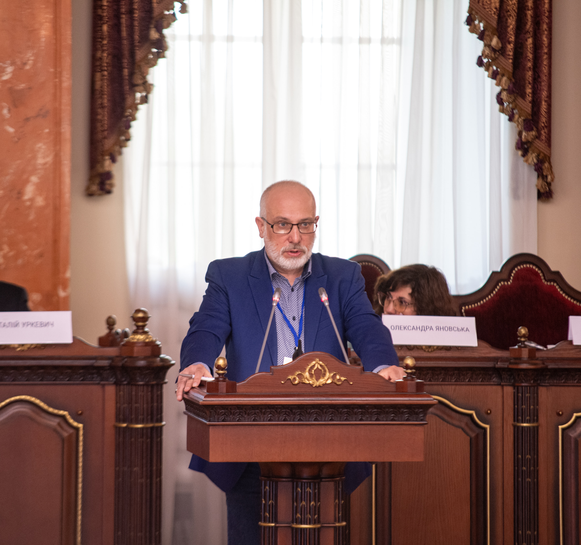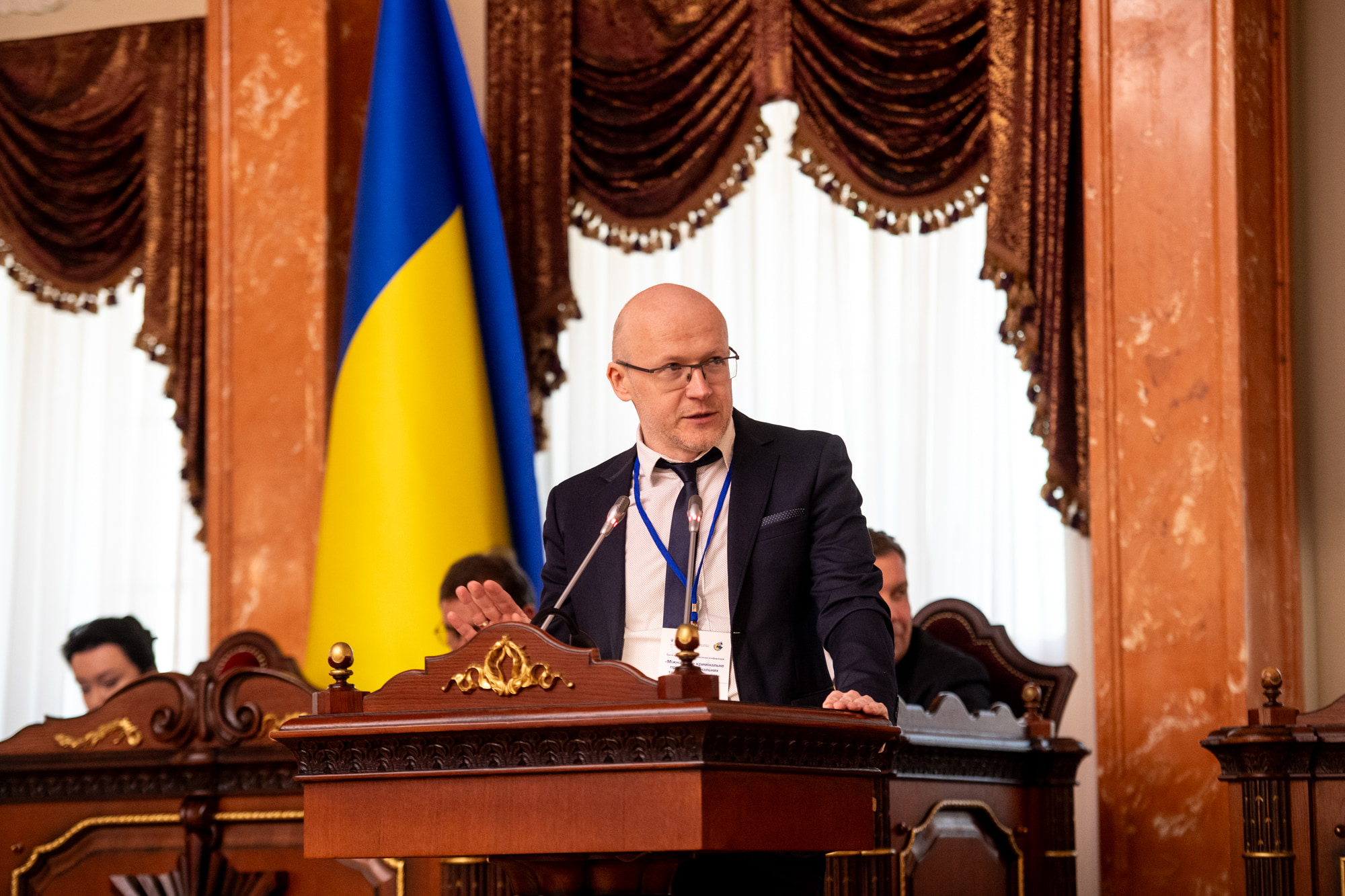 Старший співробітник проєкту Програми підтримки ОБСЄ для України Олександр Водянніков виступив з доповіддю «Між Нюрнбергом та Кампалою: злочини проти миру в Кримінальному кодексі України та судовій практиці». Спікер розповів про три основні моменти, пов’язані зі злочином агресивної війни: