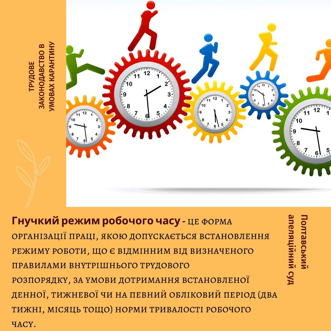 Гнучкий режим робочого часу - це форма організації праці, якою допускається встановлення режиму роботи, що є відмінним від визначеного правилами внутрішнього трудового розпорядку, за умови дотримання встановленої денної, тижневої чи на певний обліковий період (два тижні, місяць тощо) норми тривалості робочого часу.