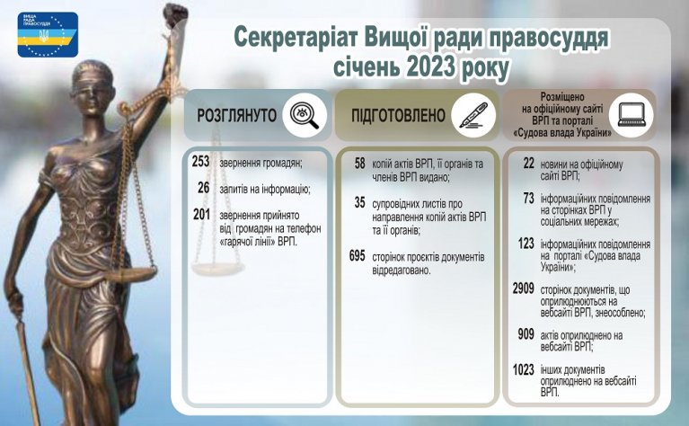 253 звернення громадян та 26 запитів на інформацію розглянуто працівниками секретаріату Вищої ради правосуддя протягом першого місяця 2023 року.