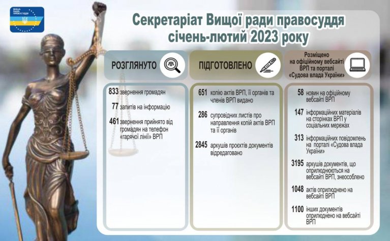 Упродовж січня - лютого 2023 року на офіційному вебсайті Вищої ради правосуддя оприлюднено 1048 актів ВРП, 1100 інших документів, 58 новин; на телеграм-каналі ВРП, фейсбук-сторінці ВРП та на YouTube-каналі ВРП – розміщено близько 150 інформаційних матеріалів.