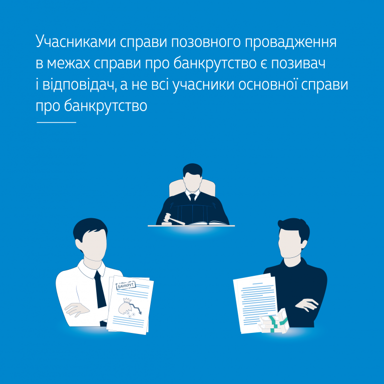 У справах про банкрутство склад учасників справи визначається КУзПБ, натомість справи позовного провадження (які розглядаються в межах справи про банкрутство в порядку ст. 7 КУзПБ) мають суб’єктний склад сторін спору, що визначається ГПК України.
