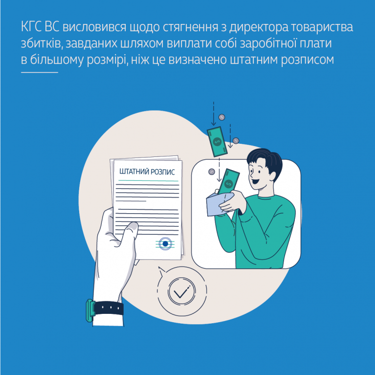Касаційний господарський суд у складі Верховного Суду зазначив, що суди попередніх інстанцій встановили, що директор товариства 22 травня 2020 року видав наказ про те, що він приступає до виконання обов'язків директора товариства «з оплатою згідно штатного розпису». Відповідно до цього штатного розпису в товаристві існувала посада директора з посадовим окладом 13 тис. грн. Однак після вступу на посаду директора товариства він цього ж дня своїм наказом затвердив новий штатний розпис товариства. Місячний фонд заробітної плати товариства зазнав змін за рахунок збільшення посадового окладу, зокрема, його директора – з 13 до 32 тис. грн.