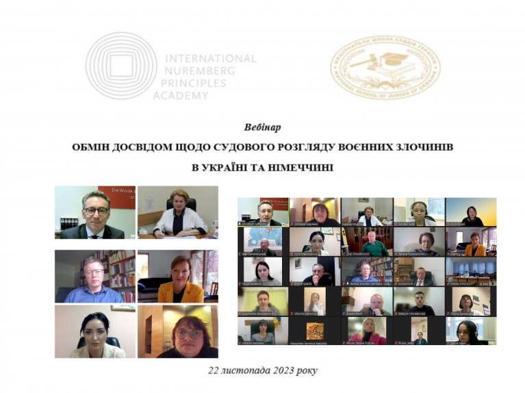 22 листопада 2023 року Національна школа суддів України спільно з Міжнародною академією Нюрнберзьких принципів провела для суддів онлайн-вебінар “Обмін досвідом щодо судового розгляду воєнних злочинів в Україні та Німеччині” із метою ознайомлення з практиками розгляду подібних справ у кожній з країн.
