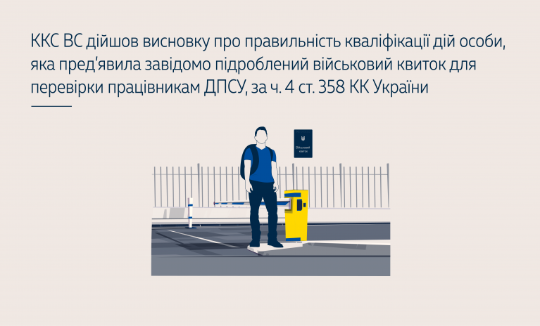 Відповідно до обставин кримінального провадження засуджений сам пред’явив завідомо підроблений військовий квиток для перевірки працівникам прикордонної служби, що утворює склад злочину, передбаченого ч. 4 ст. 358 КК України.