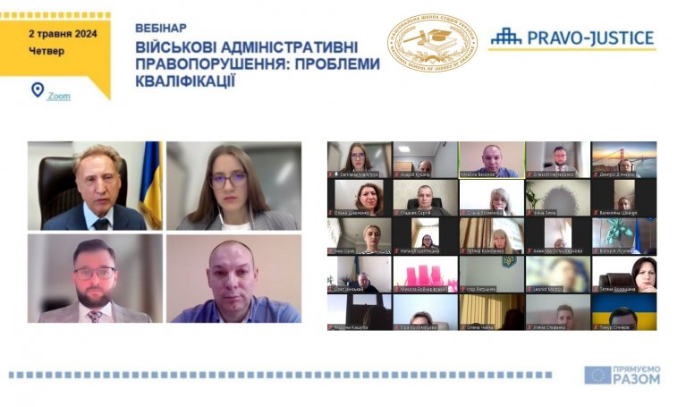 2 травня 2024 року Національна школа суддів України спільно з Проєктом ЄС "Право-Justice" провела онлайн-вебінар "Військові адміністративні правопорушення: проблеми кваліфікації" для суддів місцевих загальних та апеляційних судів із метою підвищення рівня їх кваліфікації.