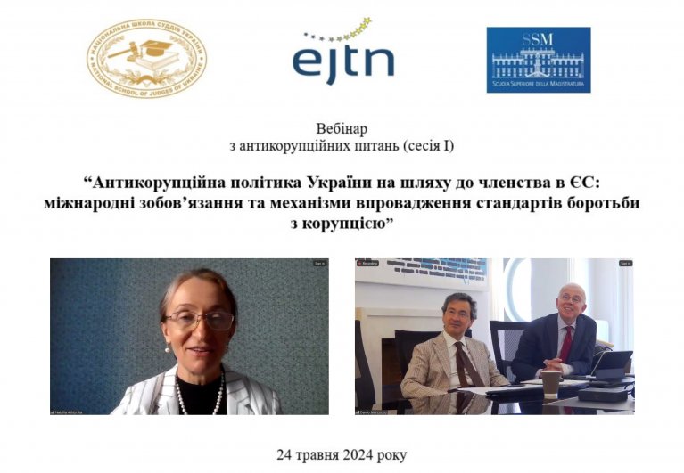 24 травня 2024 року Національна школа суддів України спільно з Вищою школою юстиції Італії та Європейською мережею суддівської освіти провела для суддів та помічників суддів Вищого антикорупційного суду онлайн-вебінар "Антикорупційна політика України на шляху до членства в ЄС: міжнародні зобов’язання та механізми впровадження стандартів боротьби з корупцією" (сесія І).