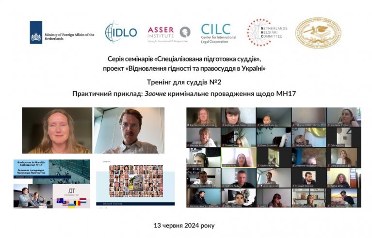 13 червня 2024 року Національна школа суддів України спільно з Інститутом Ассера (T.M.C. Аssеr Instituut), Центром міжнародно-правового співробітництва (CILC) та Нідерландським Гельсінським комітетом (NHC) провела другий із шести запланованих у червні-липні спеціалізованих семінарів для суддів, секретарів судових засідань та помічників суддів місцевих загальних та апеляційних судів "Приклад із заочного провадження: справа MH17".