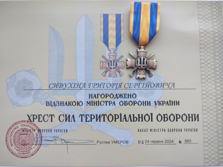 Відзнакою "Хрест Сил територіальної оборони" — нагороджений суддя Канівського міськрайонного суду Черкаської області Сивухій Григорій Сергійович за бездоганну службу, старанність, розумну ініціативу, високі особисті досягнення у службовій діяльності, відмінні особисті показники у бойовій підготовці, видатні заслуги та значний особистий внесок у справу розвитку Сил територіальної оборони Збройних Сил України.
